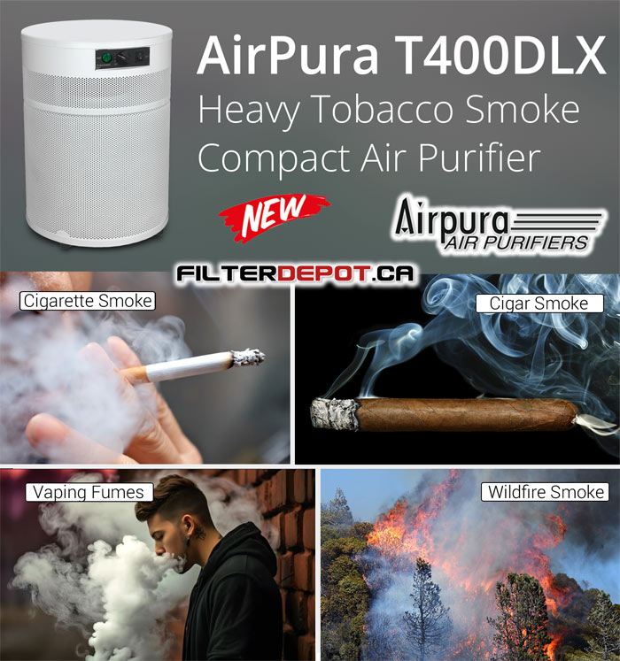 AirPura T400DLX Heavy Tobacco Smoke Air Purifier is a compact AirPura air purifier for powerful removal of Heavy Cigar and Cigarette smoke and for effective protection from primary and second hand smoke in a budget-friendly space-saving format.